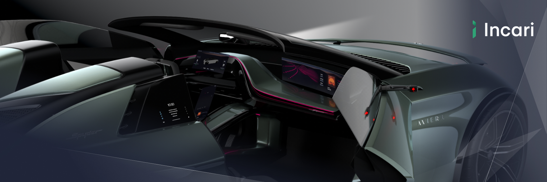 Genesis Design Studios has created an aesthetic, forward-looking showcar with the AVIERA EV8 Spyder, merging visionary automotive design with a digital user experience. Using Incari Studio, the HMI for the cockpit was developed and made fully interactive within a virtual 3D environment.